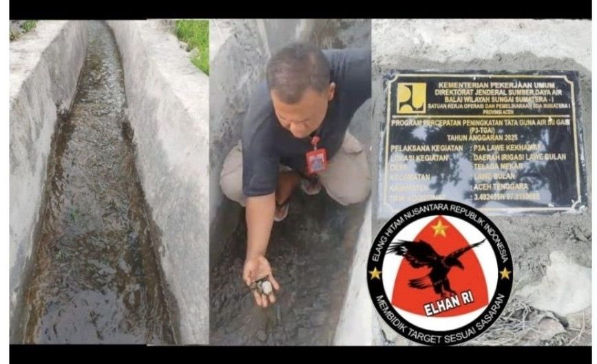Dewan Pimpinan Wilayah Lembaga Elang Hitam Nusantara Republik Indonesia (ELHAN-Ri), melalui Sekwil ELHAN-Ri Dpw Aceh Bapak Ramadani, sangat prihatin kegiatan yang dikerjakan oleh P3A Lawe Kekhambe, lokasi kegiatan daerah irigasi lawe bulan terletak di Desa telaga mekar kecamatan Lawe bulan Kabupaten Aceh Tenggara sesuai titik kordinat 3.492495N 97.816065E Provinsi aceh menggunakan Aggaran tahun 2025 diduga asal dikerja dan menggunakan material tidak sesuai perencanaan awal. (Jumat,26/12/2025).