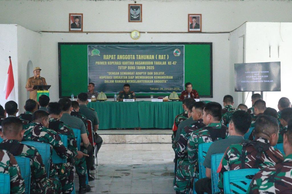 Takalar||Likeberitanews – Kodim 1426/Takalar menggelar kegiatan Rapat Anggota Tahunan (RAT) Primer Koperasi Kartika Hasanuddin Takalar Ke-47 Tutup Buku Tahun 2025 dengan tema “Dengan semangat adaptif dan solutif, koperasi angkatan siap membangun kemandirian dalam rangka mensejahterakan anggota”.