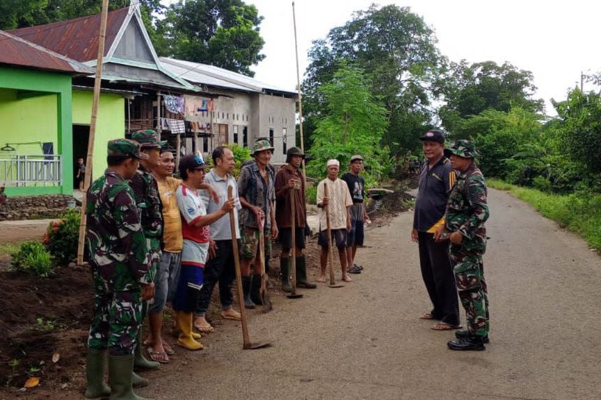 Personel Koramil 02 Polsel bersama warga nampak kompak bahu membahu saling bekerjasama membersihkan saluran air dan rumput liar yang sudah rimbun dan sangat menggangu pemandangan.